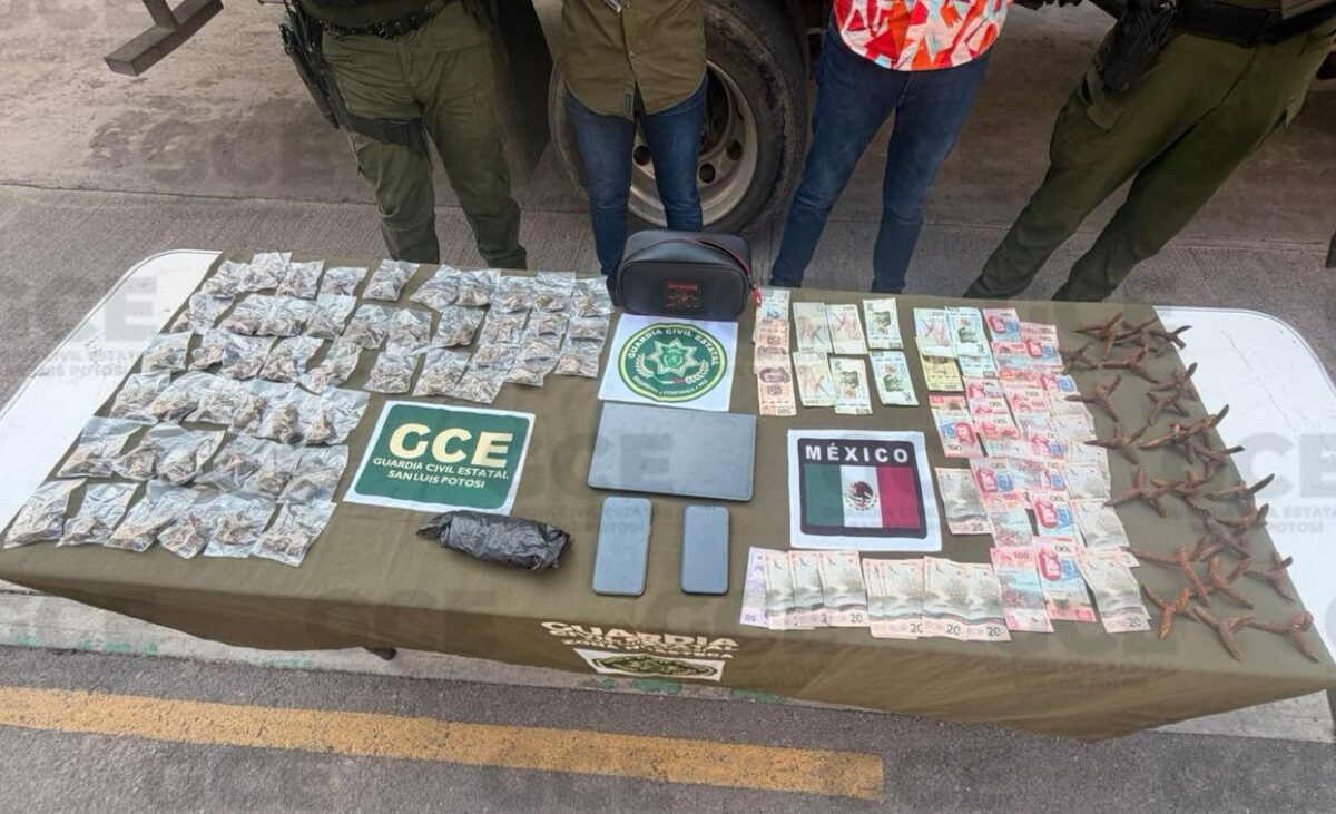 Ciudad Valles, S.L.P.- Agentes de la Guardia Civil Estatal, lograron desarticular a presuntos integrantes de una banda dedicada al cobro de piso y extorsiones a comerciantes en la región Huasteca a quienes se les aseguró droga y artefactos metálicos conocidos como “poncha llantas”.