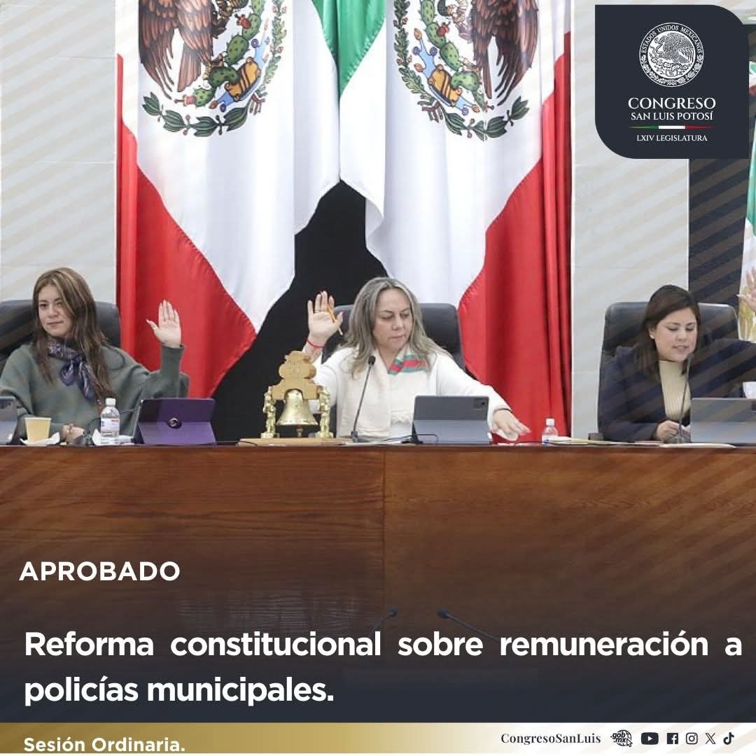 Por unanimidad, el Pleno del Congreso del Estado aprobó la reforma constitucional en materia de remuneración mínima mensual para las personas integrantes de las corporaciones de Seguridad Pública Municipales en el Estado de San Luis Potosí.