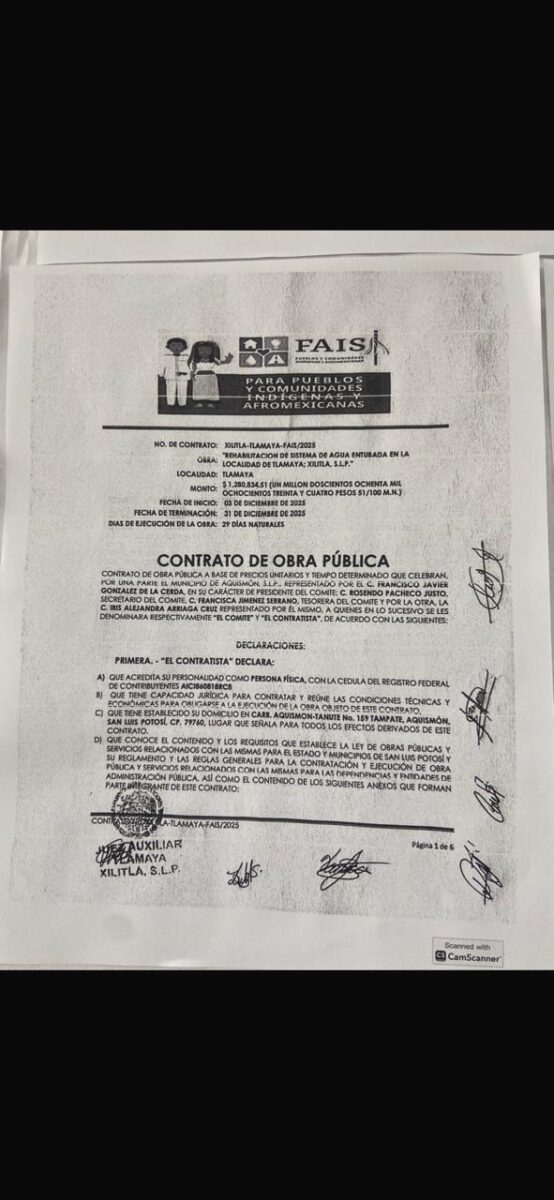 En la comunidad de Tlamaya, se detectaron inconsistencias en el contrato de una obra, ya que aunque el documento incluye los nombres de los representantes de esta localidad de Xilitla, refiere que los trabajos se realizarían en el municipio de Aquismón, específicamente en la comunidad de Tampate.