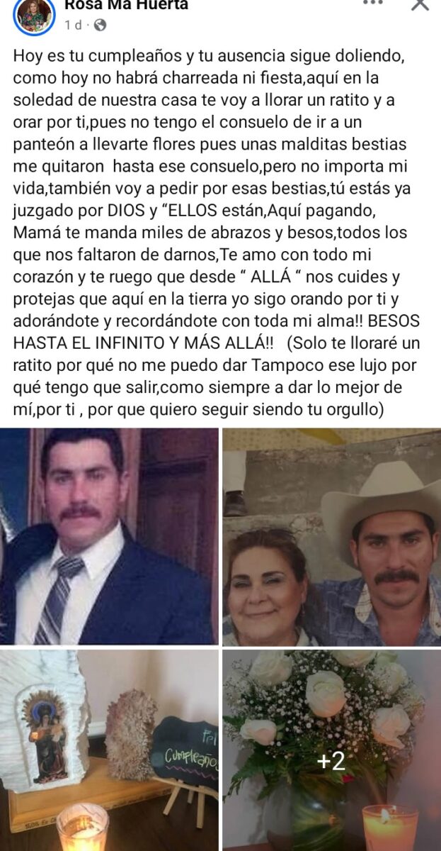 Hijo de Rosa María Huerta, originaria de Ébano, quien terminó su encargo como diputada local apenas unos días antes de los hechos; ella fue también dirigente de la CNC (Confederación Nacional Campesina), y desde hace unos años ha radicado en el municipio de Rioverde donde actualmente es funcionaria.
