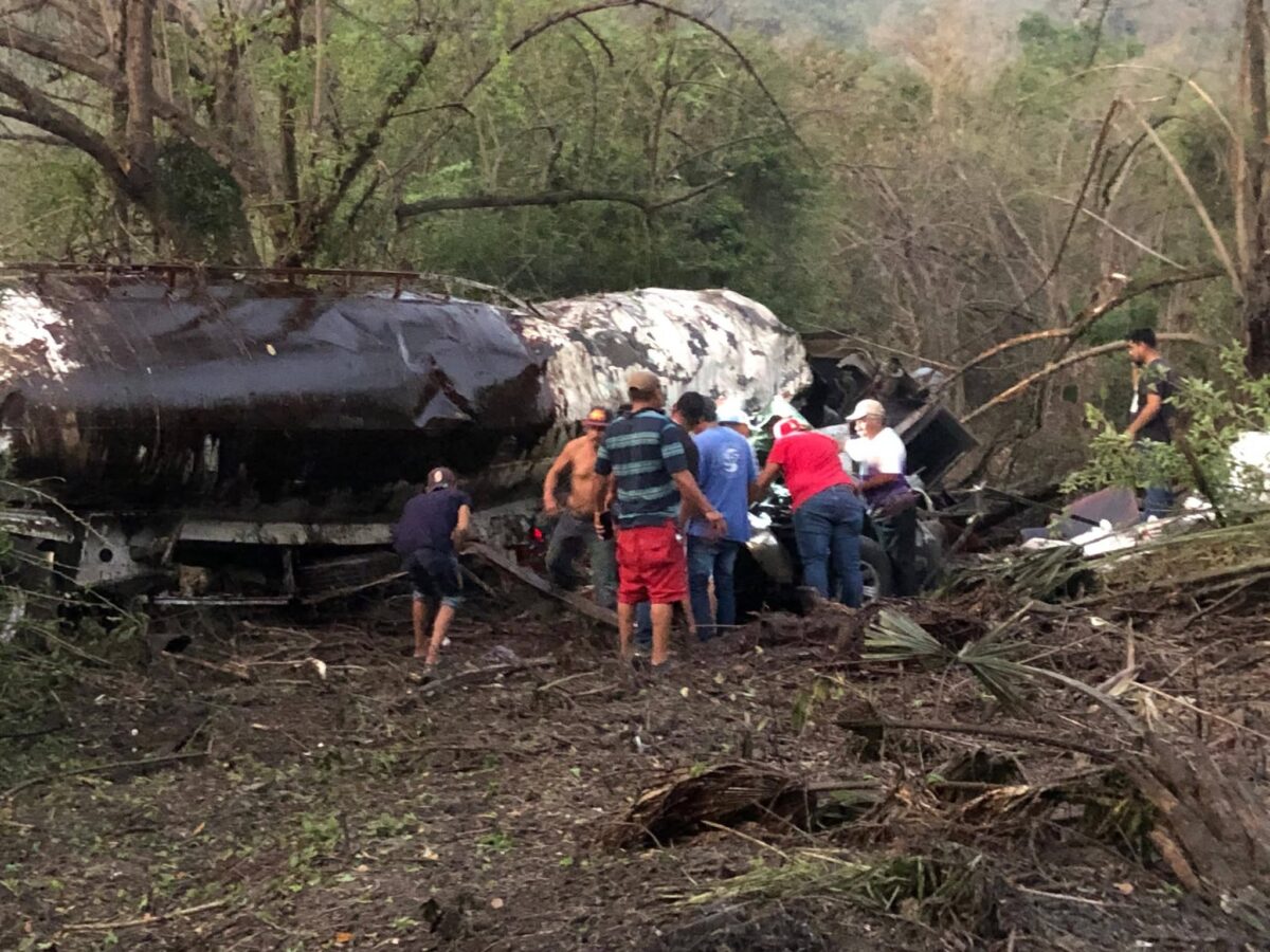 Tras el impacto, las dos unidades se fueron al barranco y la pipa cayó sobre la camioneta, quedando todos prensados.